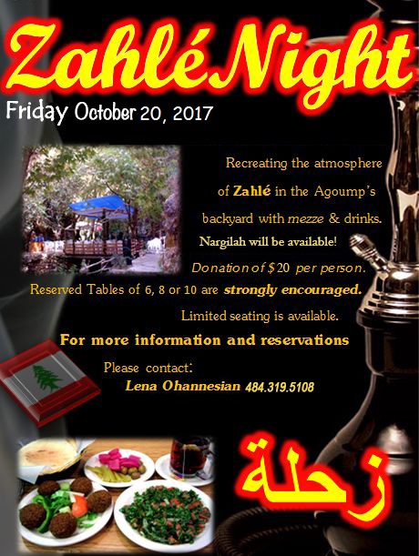 Come to Zahle Night at the Seroonian Armenian Community Center on Friday October 20th.